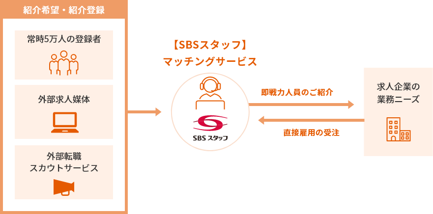 SBSスタッフが抱えている豊富な登録スタッフ5万人の中からお客様業務に対してマッチングする求職者を過去の職歴経験、資格や希望職種などからピックアップし、お客様の即戦力となる人員をご紹介いたします。また、当社では外部媒体による応募活動も積極的に行っており、求人企業様の採用広告を無料で外部媒体に掲載する事も可能です。