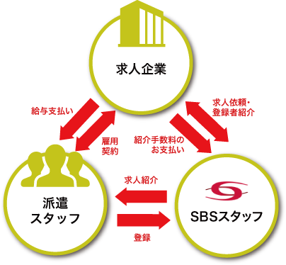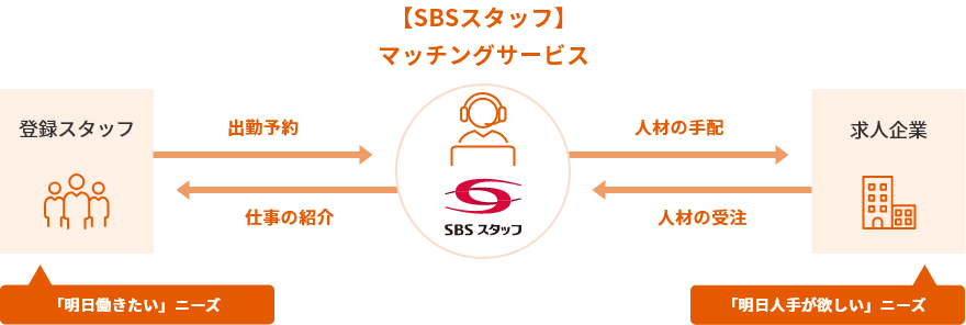 SBSスタッフでは、5万人の登録スタッフの勤務ニーズとお客様の人材ニー ズを組み合わせる独自のマッチングシステムにより最短1日からの人材派遣やご紹介を可能としました。